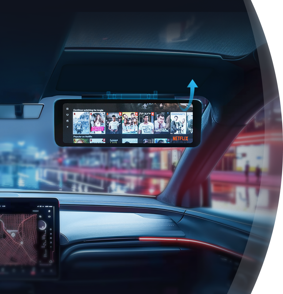 兆威后排吸頂屏,通過產品殼體帶動屏幕組件旋轉,旋轉角度存在多個檔位,使用者可調整屏幕角度,同時還具備限位功能,遇到顛簸路況也能保持穩定。